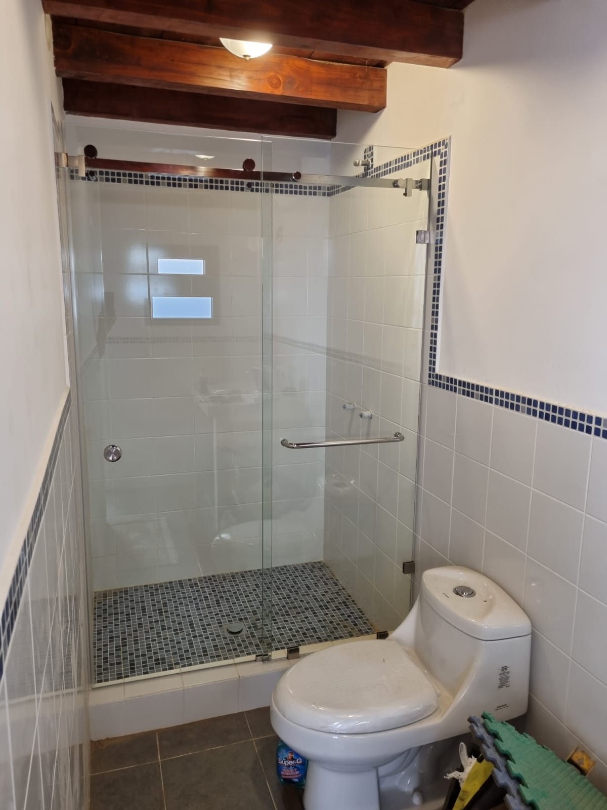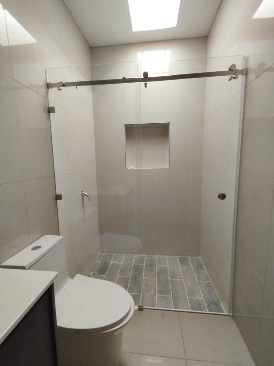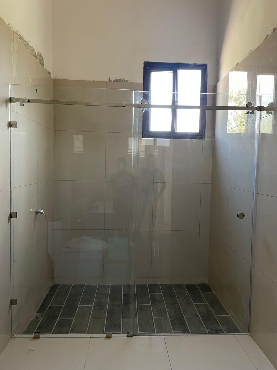 Puertas de ducha, disponibles en vidrio templado corredizas y abatibles; y en PVC blanco e imitación madera (nogal claro, oscuro o roble). Variedad de vidrios a elegir.