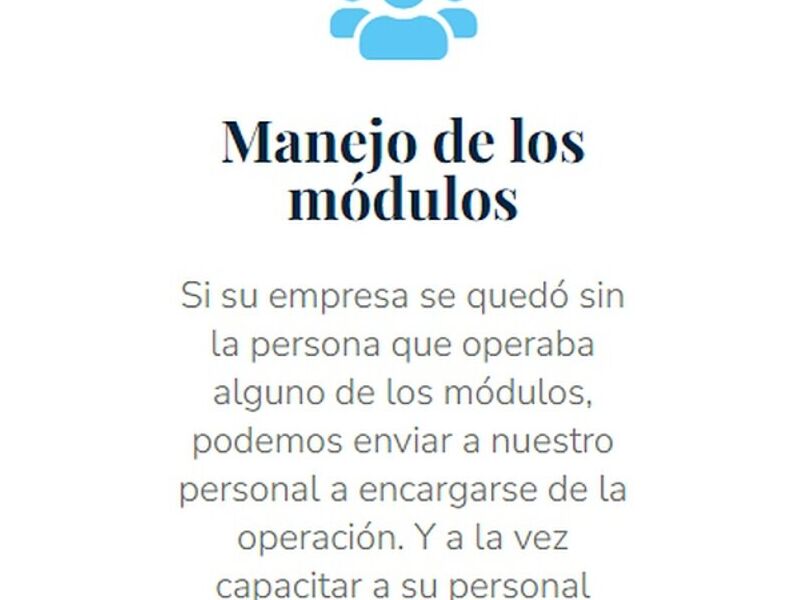 Si su empresa se quedó sin la persona que operaba alguno de los módulos, podemos enviar a nuestro personal a encargarse de la operación. Y a la vez capacitar a su personal