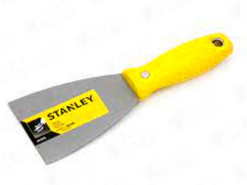 Espatula de acero inoxidable reforzada con mango de plástico.