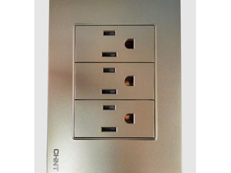 Tomacorriente triple vertical color beige para instalación en pared.