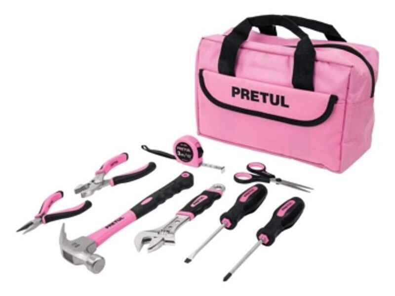 Kit de herramientas color rosa, cuenta con 8 piezas y un bolso para guardar todo.