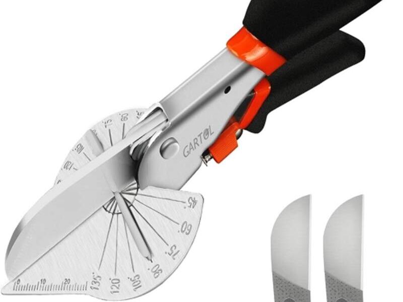 GARTOL Tijeras de inglete: tijeras de tronco multifuncionales para corte angular de moldeado y recorte, ajustables de 45 a 135 grados, herramientas manuales para cortar madera suave, plástico, PVC, con cuchillas de repuesto.