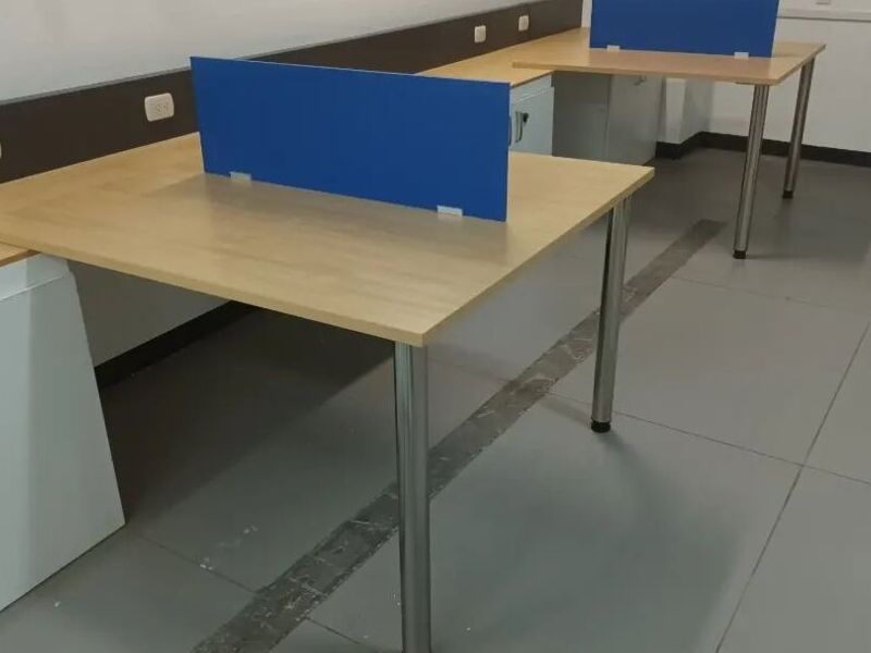 EUROLAMY Estaciones BENCHmira, para área de ventas en línea. Con acento en gris para paso de cables y ductos. Laminado Maple en combinación de blanco y pantallas Azul.