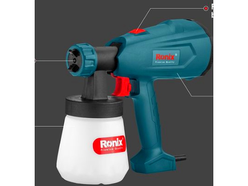 La pistola de pintura eléctrica Ronix código 1335V está dotada de un motor de 350W y un contenedor desmontable de 700 mililitros. Es un producto ideal para pintar ambientes domésticos e industriales. Suele usarse para pintar todo tipo de superficies, sean de metal, madera, piedra, arcilla (cerámicos) y porcelanas, plástico, vidrio o textil.
