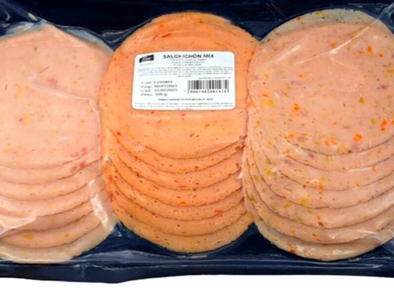 Presentación paquete de 300 g. 100 g. salchichón con champiñones 100 g. salchichón con aceitunas 100 g. salchichón con pimientos
