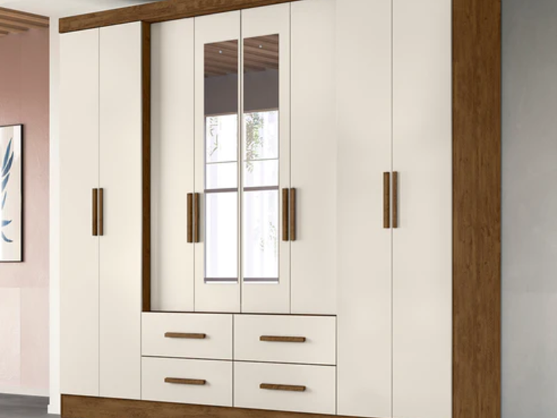 Con el armario San Lorenzo podrás añadirle un toque rústico a tu hogar. El material del que está hecho este gran mueble de importación es de Madera ingenierizada MDP con recubrimiento pintura UV en color natural en sus laterales y en blanco para sus puertas. Cuenta además con espejo central.