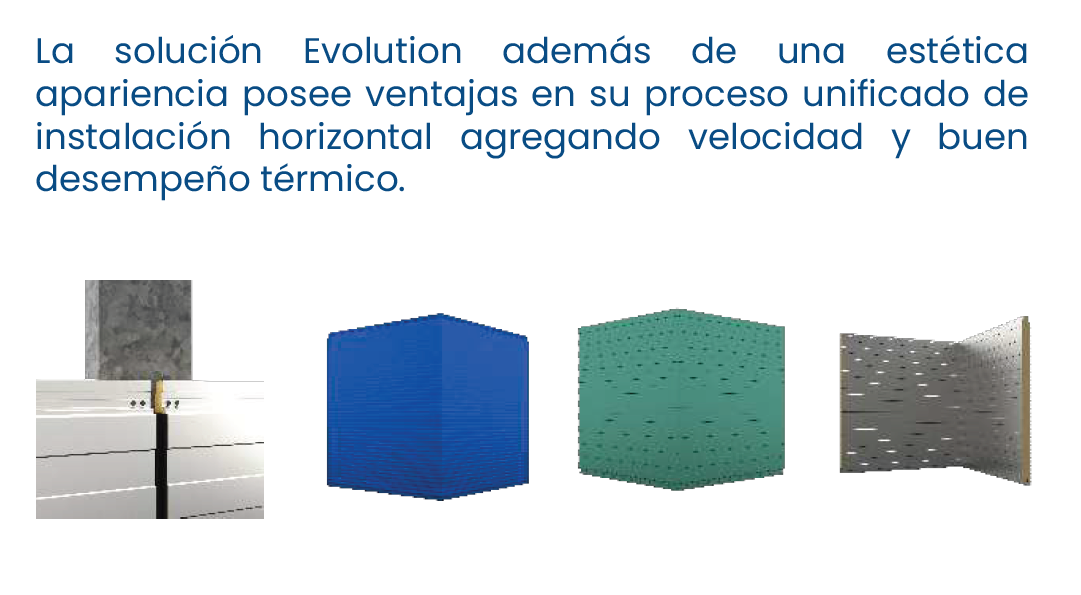 Sistema de fachada arquitectónica Evolution, diseñado para ofrecer una apariencia moderna y uniforme con instalación horizontal de alta eficiencia. Su sistema optimiza los tiempos de montaje y proporciona excelente desempeño térmico, convirtiéndose en una solución ideal para proyectos que buscan rapidez constructiva, estética contemporánea y alto rendimiento en envolventes arquitectónicas.