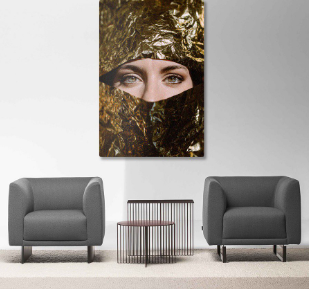 Sala de estar con dos sofás grises y un cuadro de retrato artístico, ideal para un ambiente clásico y elegante.
