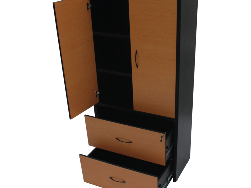Librero a piso con archivero horizontal de dos gavetas tamaño carta con sistema de seguridad, archivo colgante y dos puertas de bandera con tres espacios internos. Fabricado en melamina de diseño 28 y 16mm con canto PVC rígido