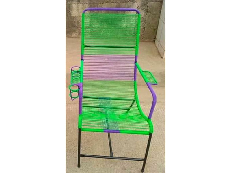 Silla fabricada en mimbre plástico de colores verde y lila.