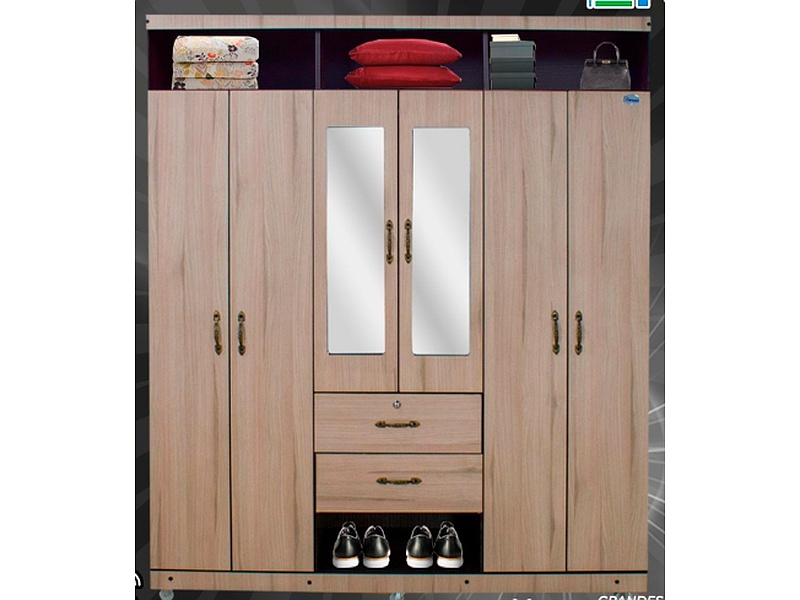Ropero con acabado de madera, 6 puertas tipo closet y 2 cajones para guardar ropa, además de poseer un espacio para zapatos.