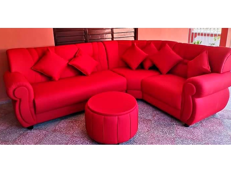 Sofá en L curvo en color rojo.