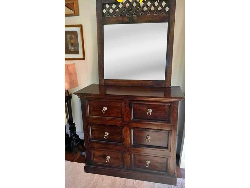 Mueble colonial de madera de pino, posee 6 cajones y un espejo.