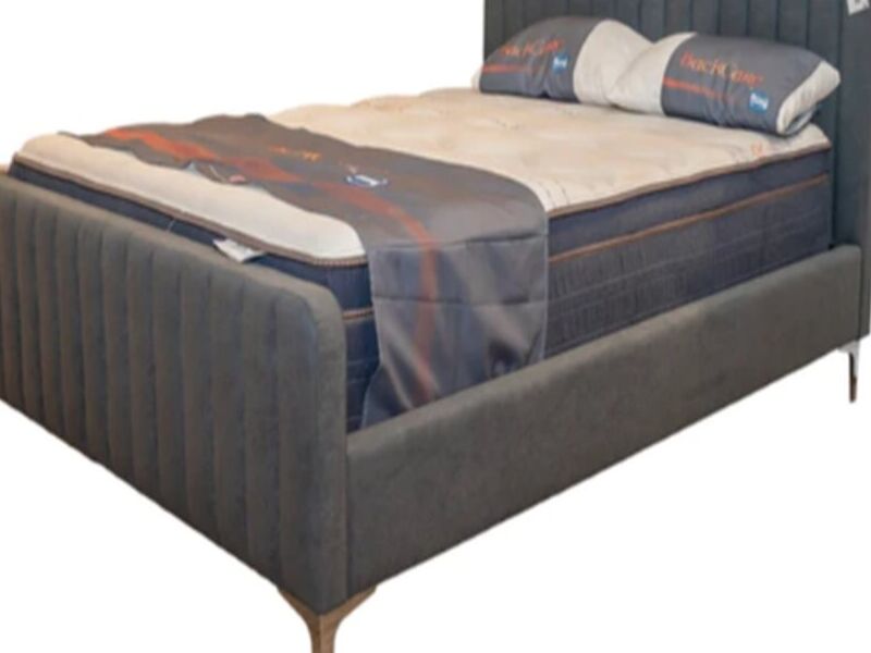 Cabecera marco tela gris claro Patas metal cromado Slats de madera Frente:209cms;Prof:152cms;Alto:102cms Colchon se vende por separado