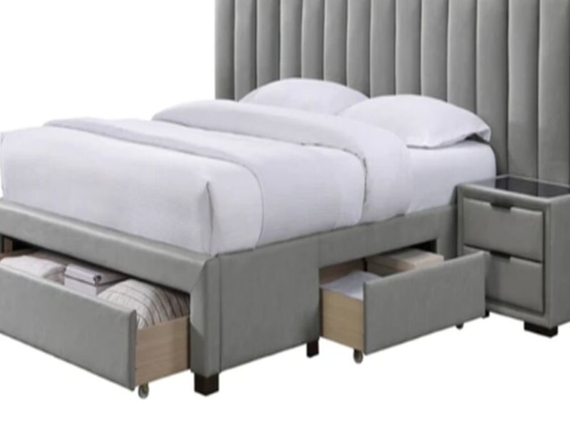 Cuero textil gris claro Patas madera color cafe 3 gavetas Frente:153cms; Prof:204cms Premium PU 1.4mm, resistente al agua y antiara?azos Colchon se vende por separado