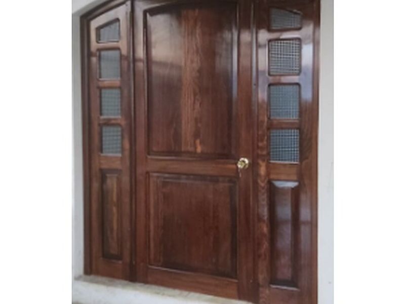 Puerta principal de entrada de madera y vidrio de diseño moderno, hecha a medida, con parte superior redondeada. Puerta interior doble de madera y PVC para apartamentos y villas.