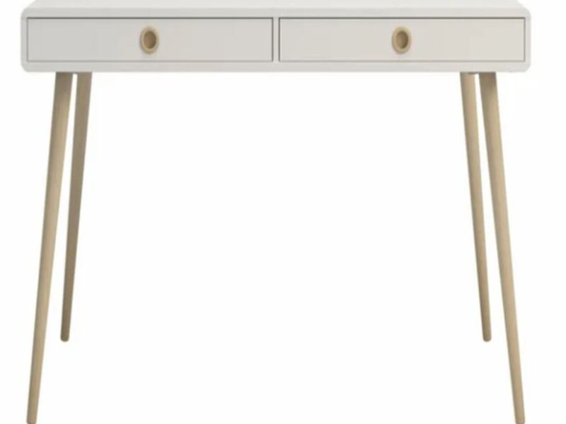 MDF laca blanco Patas roble 2 gavetas Frente:130.1cms;Prof:69.8cms;Alto:75.9cms Peso maximo que soporta top 8kgs;gavetas:8kgs