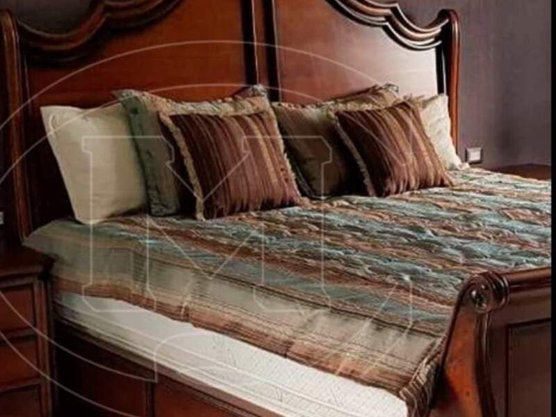 Hermosa cama con cabecera completamente hecho de madera.