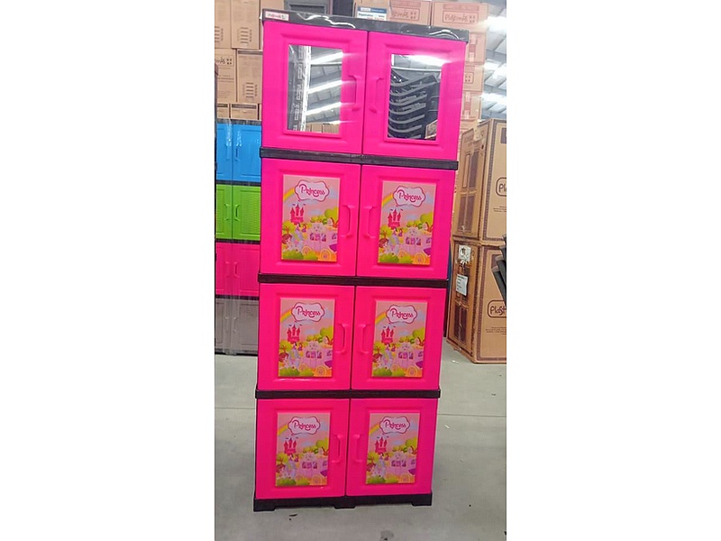 Gabinete multiuso de color rosa, con espejo.