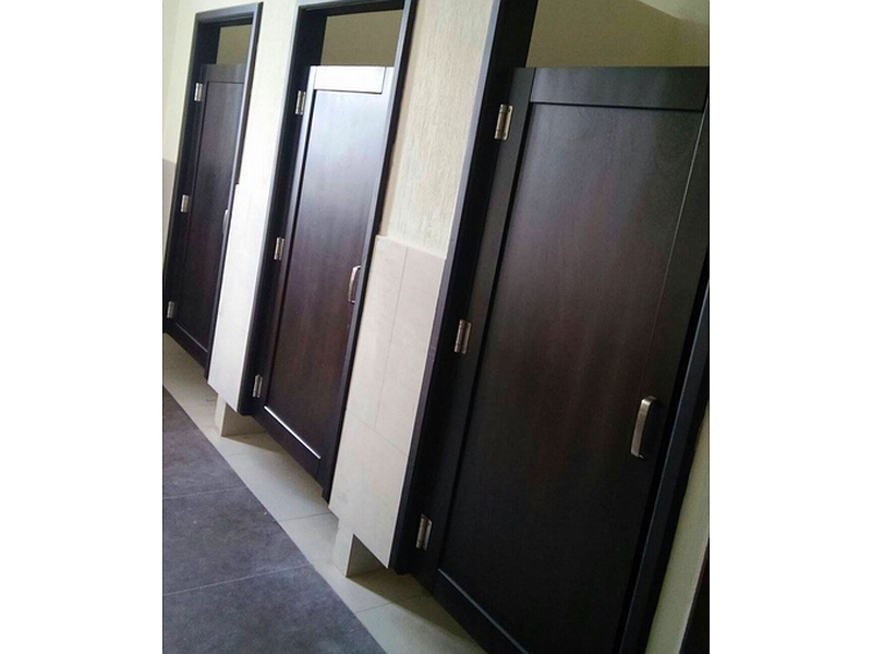 Puertas para sanitarios, de color caoba.