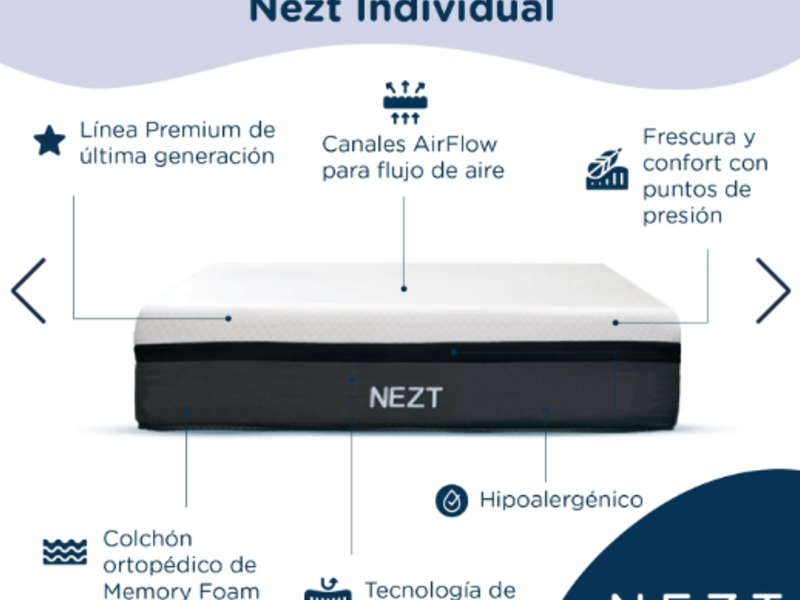 La ergonomía perfectaEl colchón premium favorito con tecnología mejorada de descanso.Nezt Memory Foam: el colchón que revolucionó todo✅ Cuando estás cómodo, duermes, es así de simple. ¡Compruébalo!✅ Colchón ergonómico suave y cómodo sin comprometer el soporte.✅ Memory Foam y Viscoelastic diseñados especialmente para aliviar los puntos de presión.✅ El primer Colchón empacado al vacío y enviado en caja de México.✅ Materiales hipoalergénicos, antiácaros y antibacterianos con certificación mundial CertiPUR-US.✅ Es un colchón firme sin ser duro. En escala de 1 a 10, el Nezt es un 7.5.