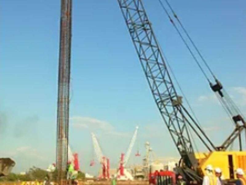 Construcción de pilotes de 1.00 metro de diámetro y profundidad aproximada de 40.00 metros. Incluye hincado de camisa perdida en la totalidad del pilote, perforación de terreno, colocación de armadura y vertido de hormigón. Formado y colocación de 2,000,000 de kilogramos de acero.