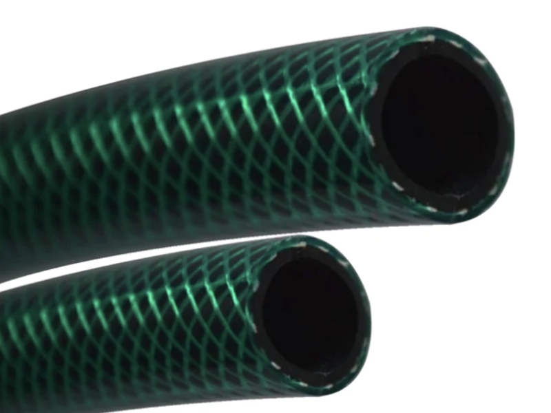 Manguera versátil fabricada en PVC con tonalidades verdes para riego de pequeños cultivos, jardines y limpieza de carros, objetos o superficies.