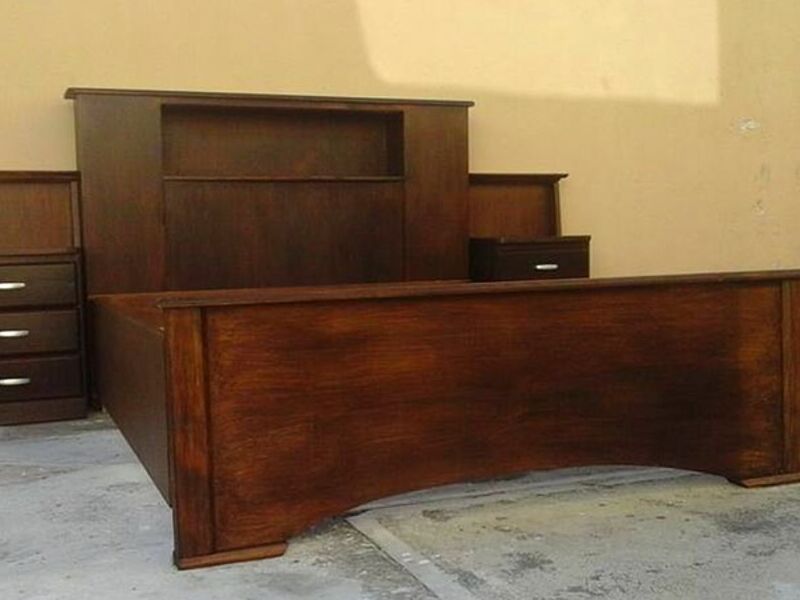 Cama tamaño Queen, fabricada en madera solida de pino chileno, cabecera con repisa incluida, dos mesas de noche de tres gavetas cada una, con carrileras.