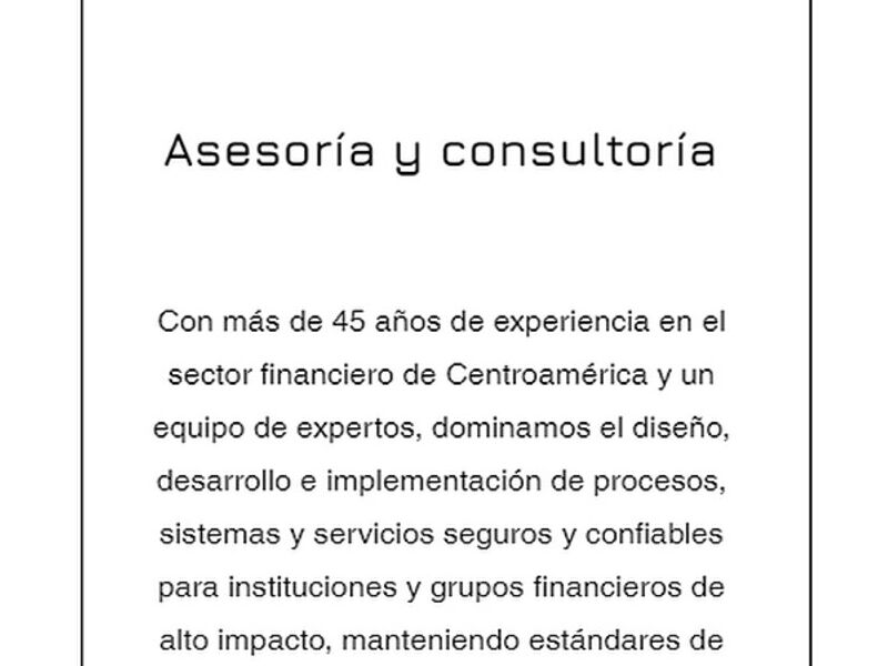 Con más de 45 años de experiencia en el sector financiero de Centroamérica y un equipo de expertos, dominamos el diseño, desarrollo e implementación de procesos, sistemas y servicios seguros y confiables para instituciones y grupos financieros de alto impacto, manteniendo estándares de excelencia."