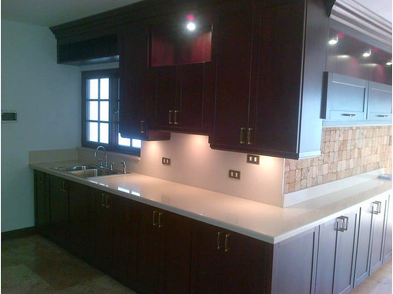 Cocina integral elaborada en madera color caoba.