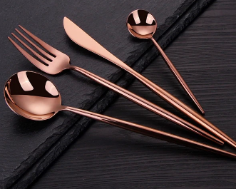 Juego de cubiertos modernos en tonos dorado y negro.