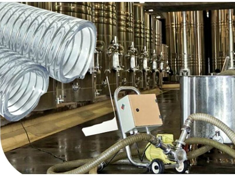 Manguera transparente de grado alimenticio reforzada con alambre de acero, utilizada especialmente para succión o transferencia de agua potable, jugo, leche, cerveza y otros productos en la industria de alimentos y bebidas con bombas, tanques u otras máquinas.