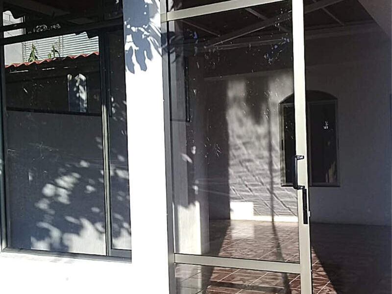 Ventanas y puertas corredizas proyectable y fijas en aluminio anodizado inox con vidrio flotado bronce de 5 mm.