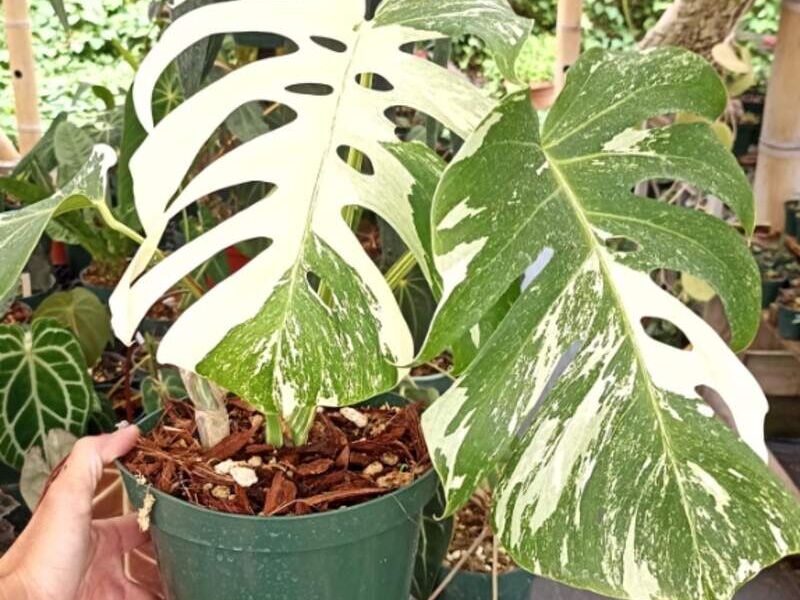 Planta dividida por acodo aéreo de una planta madre de más de 12 años. Posee sistema de raíz y está adaptada a condiciones de invernadero con un saran del 60%.